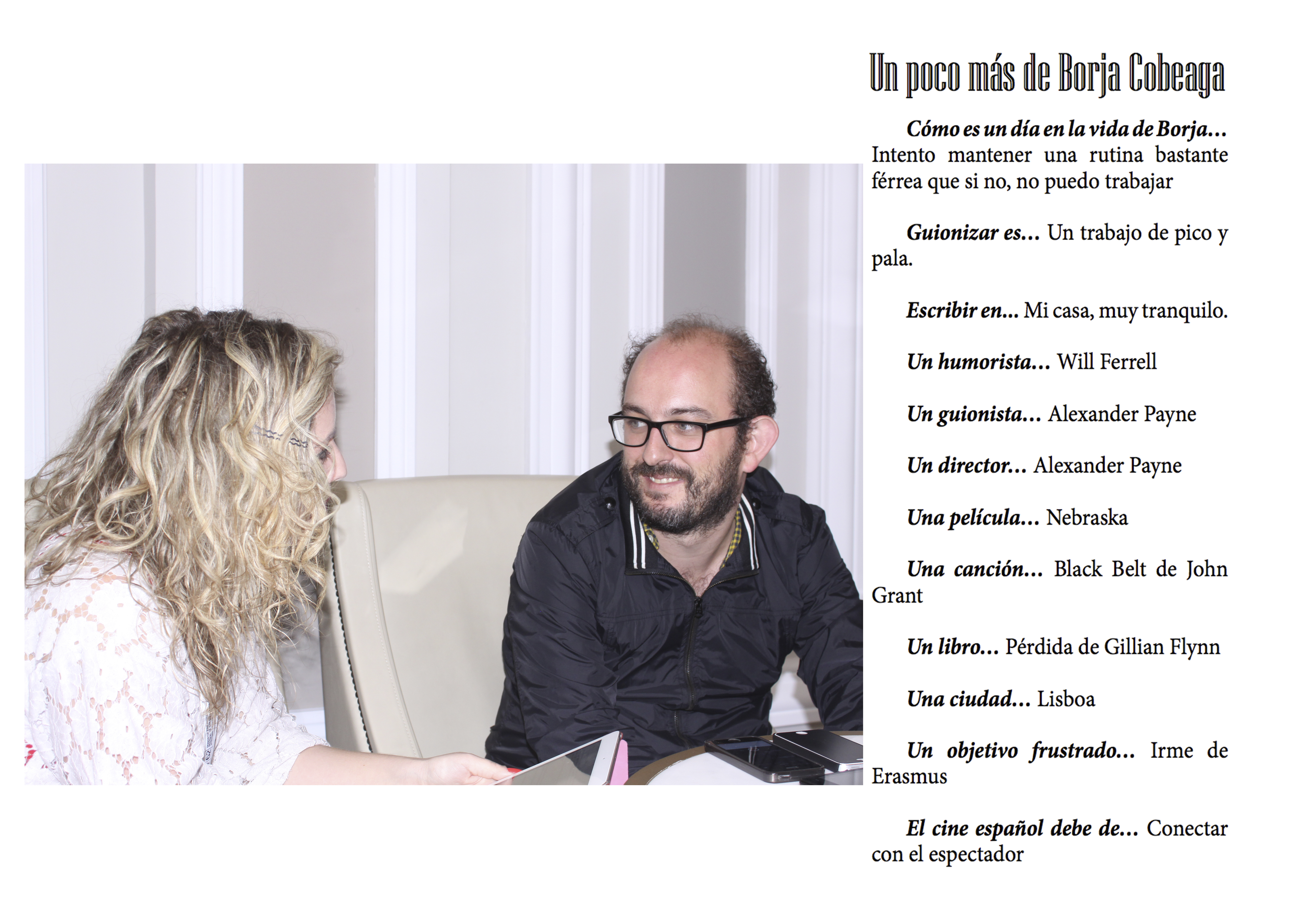 Guionista, director de cine y vasco de nacimiento, Borja Cobeaga se encuentra en el punto álgido de su carrera. Tras el éxito en taquilla de su penúltimo largometraje ‘Ocho apellidos vascos’, guión llevado a cabo junto a su inseparable amigo y compañero de oficio Diego San José, consigue el mérito de ser el creador de la película española más taquillera de la historia con 50 millones de euros de recaudación.